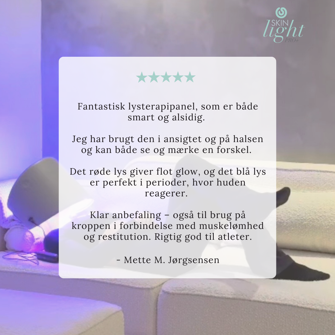 Jeg er virkelig glad for mit lyspanel og imponeret over effekten! Har brugt det 3-4 gange om ugen i en måned nu, og kan allerede se en stor forbedring i min vintertrætte hud, som tydeligt har fået mere glød og føles mindre tør. Fine linjer begynder også at mindskes – og så er det bare mega dejligt at ligge under det varme lys og slappe af. Har tidligere fået lysbehandling i klinik og jeg må bare sige, at dette panel giver mindst lige så gode resultater, hvis ikke bedre. Super nemt at bruge og fylder ikke ret meget. Jeg er kæmpe fan og kan kun anbefale andre at investere i Skinlight Pro+ lyspanelet!